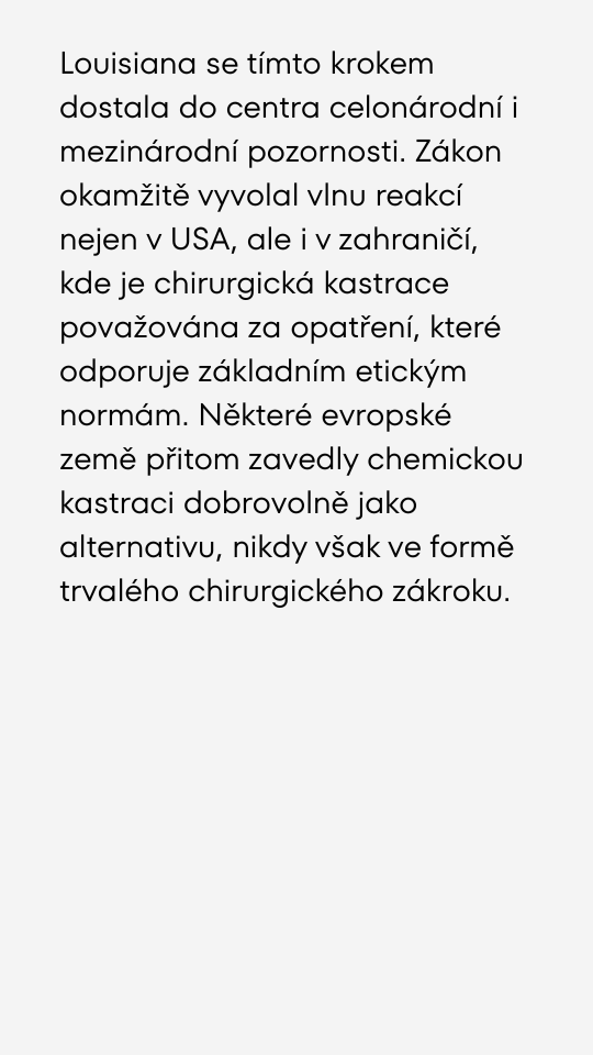 Soudci v Louisianě mohou nařídit chirurgickou kastraci u pachatelů trestných činů proti dětem mladším 13 let.