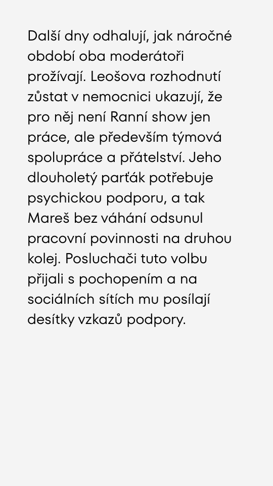Leoš Mareš chyběl v ranní show. Rozhodl se zůstat v nemocnici u Patrika Hezuckého.