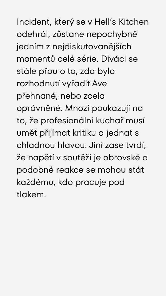 Skandální chování Ave v reality show Hell´s Kitchen. Arogance a výbuch emocí.