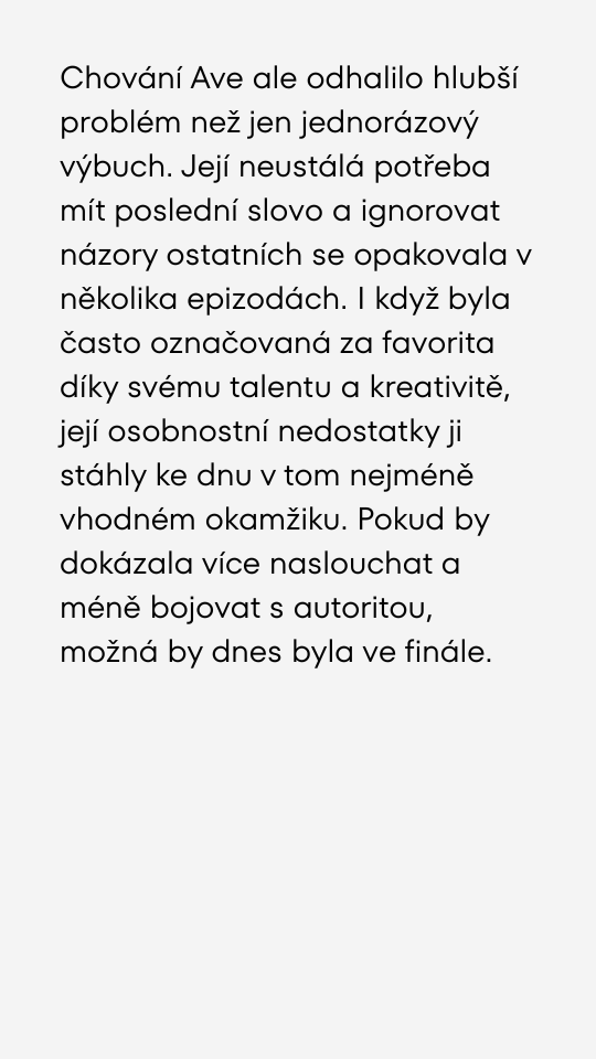 Skandální chování Ave v reality show Hell´s Kitchen. Arogance a výbuch emocí.