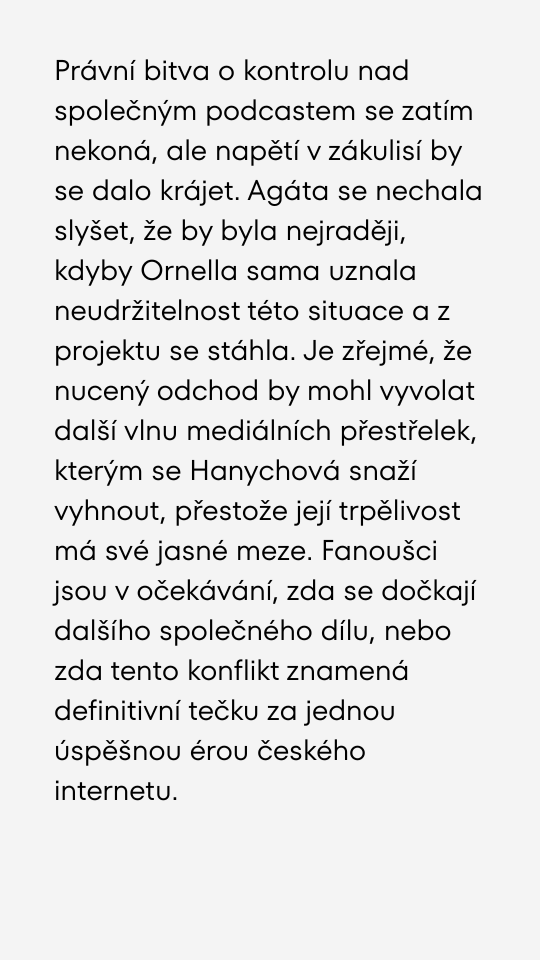 Konec velkého přátelství? Agáta Hanychová chce odchod Ornelly z podcastu.