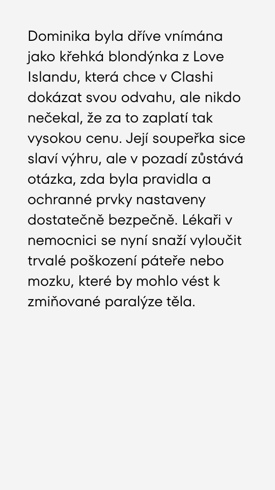 Dramatická dohra zápasu v Clashi! Dominika Horáková skončila v nemocnici na JIPce. Trenér mluví o hrozbě ochrnutí.