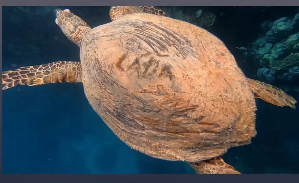 Ohavný čin Čecha v Egyptě. Vyryl do želvího krunýře jméno Láďa.