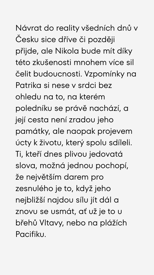 Vdova po Patriku Hezuckém utekla před bolestí na Nový Zéland. Lidé ji za to píšou drsné vzkazy.